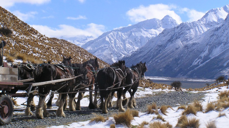 Erewhon Station is a 35,000 acre property situated at the foothills of the Southern Alps at the top of the Rangitata River. Erewhon Station was originally made famous by the book Erewhon written by Samual Butler. Your day begins with a scenic journey across the vast Canterbury plains, the largest area of flat land in New Zealand and then heading into the stunning Canterbury high country with its rugged mountain ranges, crystal blue lakes and fresh crisp mountain air. We will stop at Lake Clearwater for morning tea and a photo opportunity with beautiful views looking across Lake Clearwater to the mountains in the distance. Next we will continue travelling back in towards the mountains and past the site of a Lord of the Rings filming location of 'Edoras' on Mt Sunday where we will stop for a photo opportunity before continuing on to the end of the road and onto Erewhon Station itself. Erewhon is a play on the word “nowhere” spelled backwards. At Erewhon you will get to meet the owners of the property, Colin and Erin, this working high country station farms Merino sheep, Hereford Cattle, deer and includes a large Clydesdale Horse Stud. A lot of the work on the property is still undertaken using the Clydesdale horses such as towing wagons and working the fields by towing plows, your time at the property will be spent enjoying a unique Clydesdale horse wagon ride experience and enjoying a picnic lunch in a spectacular setting while soaking in the amazing views. After lunch we will make our return journey back to Christchurch. This is a truly unique experience not to be missed!
